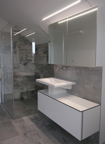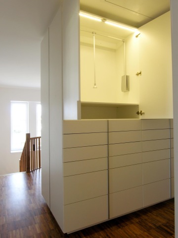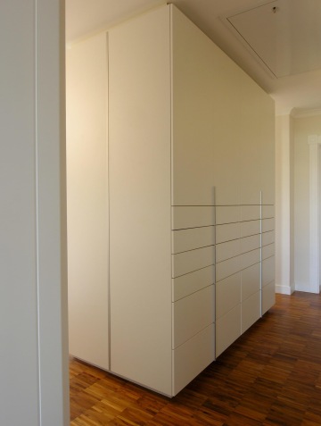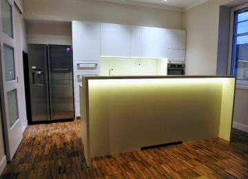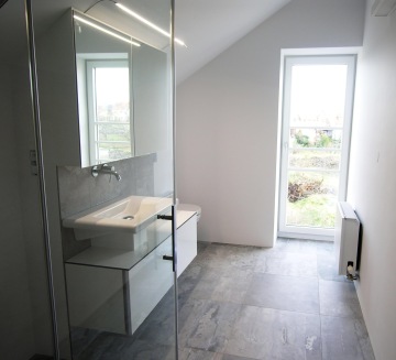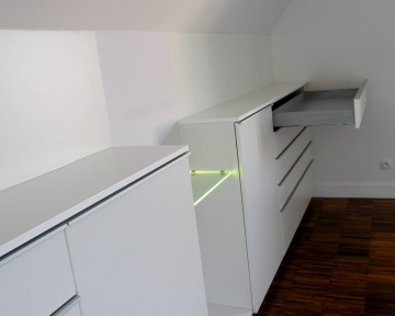 Rodinný dům v Jihomoravském kraji jsme vybavili novým nábytkem do koupelny, kuchyní, šatními skříněmi a úložným nábytkem do ložnice. Tato realizace byla z hlediska dekorů úsporná, použito bylo lamino v odstínu arktické bílé. Výrazné dekory podlah si takové řešení vyžadují. Ozvláštňujícím prvkem je použití materiálu Compact v tloušťce 10 mm s černým jádrem jako pracovních desek. Nábytek díky tomu působí vzdušným a nadčasovým dojmem.