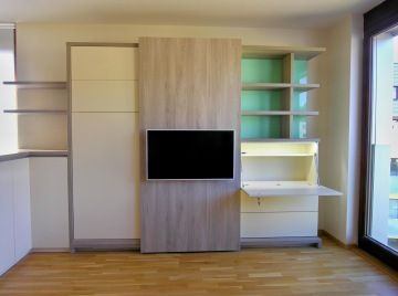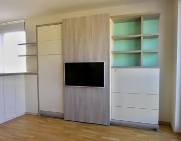 Největší prostorové úspory v místnosti bylo dosaženo použitím sklopné postele. Ta je zabudovaná v sestavě, a proto plní více funkcí - sestava slouží zároveň jako obývací stěna a také kancelářský koutek.