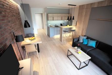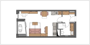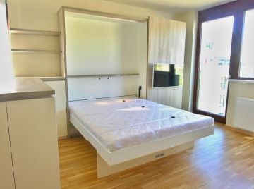 V této garsonce se podařilo na velmi malém prostoru dosáhnout kombinace praktičnosti a stylového bydlení. Klíčové je použití sklopné postele, díky které vznikl dostatek prostoru pro vybavení obývací části tak, aby nemuselo docházet k dennímu přesouvání nábytku.