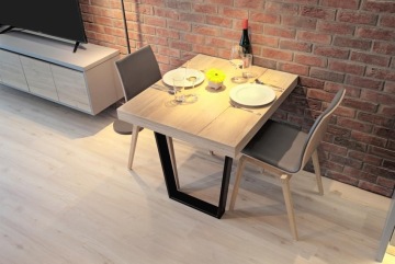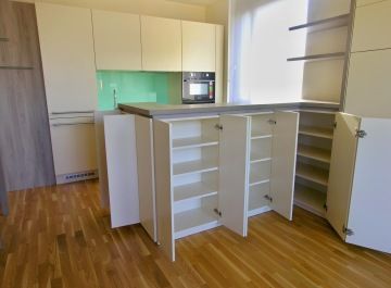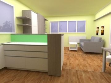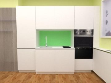 Vestavná trouba, lednice a mikrovlnná trouba jsou zabudovány ve skříni po levé straně. Potravinová skříň se skládá ze tří částí a také díky nástavcům nabízí dostatek úložného prostoru. Jídelní stůl je rozkládací a vejdou se k němu až čtyři židle.
