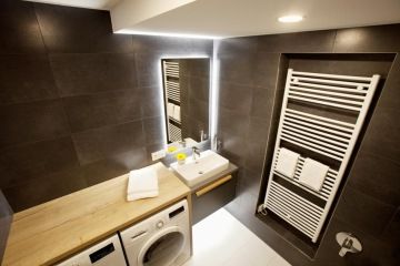 V koupelně se nachází pračka, sušička, sprchový kout a koupelnová skříňka která díky vnitřnímu dělení poskytuje dostatek prostoru pro všechny drobnosti, které v koupelně potřebujete.
