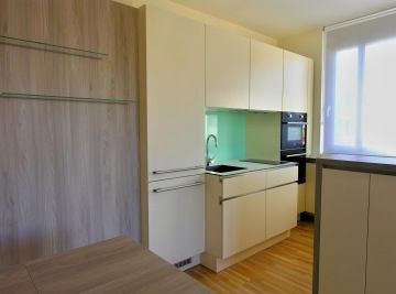 Jemný jasanový dekor v kombinaci s krémově bílou a výrazným barevným prvkem v podobě zeleného lakovaného skla podporuje vzdušnost malého prostoru. Stejná barevná kombinaci se opakuje také v kuchyni, čímž je dosaženo kompaktního a čistého designu.