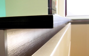Protože skříňky v ostrůvku tvoří zároveň bar – a tím prostor k sezení navíc – použili jsme místo klasických úchytek profily, které nebrání přistavení barových židlí a také podporují jednoduchý a čistý vzhled kuchyně. Při stolování není třeba se omezovat - v kuchyni se nachází klasický rokládací jídelní stůl.