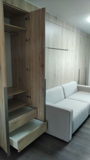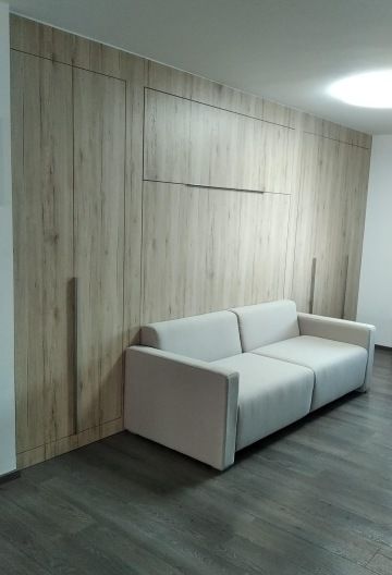 Pohovku není potřeba při skladání nebo rozkladání postele nikam přesouvat, je k ní napevno přimontovaná a opěrka sedačky se při sklápění sama složí do korpusu. Čalouněné čelo napevno montujeme za ložnou část postele a slouží především pro zvýšení pohodlí a jako estetický prvek.