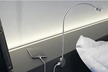 Kovová čtecí lampička Hafele s ohýbatelným ramenem a USB vstupem je praktickým doplňkem. Protože lampičku pevně namontujeme do sklopné postele, není třeba kvůli světelnému zdroji přistavovat k posteli noční stolek. Nabízíme také ekonomičtější variantu těchto čtecích lampiček od značky Modus Touch.