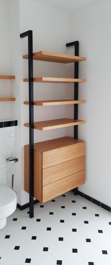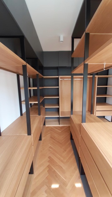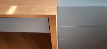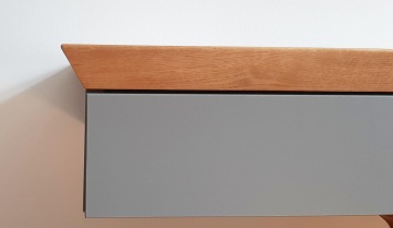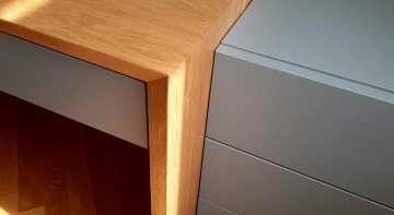 Mezi nejzajímavější kusy nábytku v tomto domě patří komoda v obývacím pokoji jejíž povrch jsme upravovali lakováním v odstínu vybraném zákazníkem a exkluzivní knihovna z tenkých kompaktních desek.